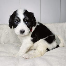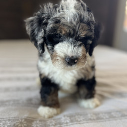Just like his dad, Apollo has blue eyes and is full of brilliance and charm ☀️. Born August 9, 2025, he’s expected to weigh around 12 lbs full grown. His mom, Breezy (30 lb F1B merle abstract Bernedoodle), and his ...