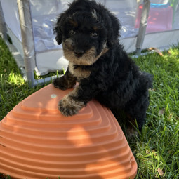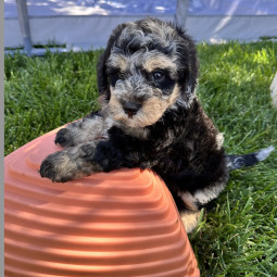 Meet Poseidon, named after the god of the sea 🌊. Born August 09, 2025, Poseidon is expected to reach 15 lbs full grown. His mom, Breezy (30 lbs F1B merle abstract Bernedoodle), and dad, Apollo (100% merle phantom poodle), passed ...