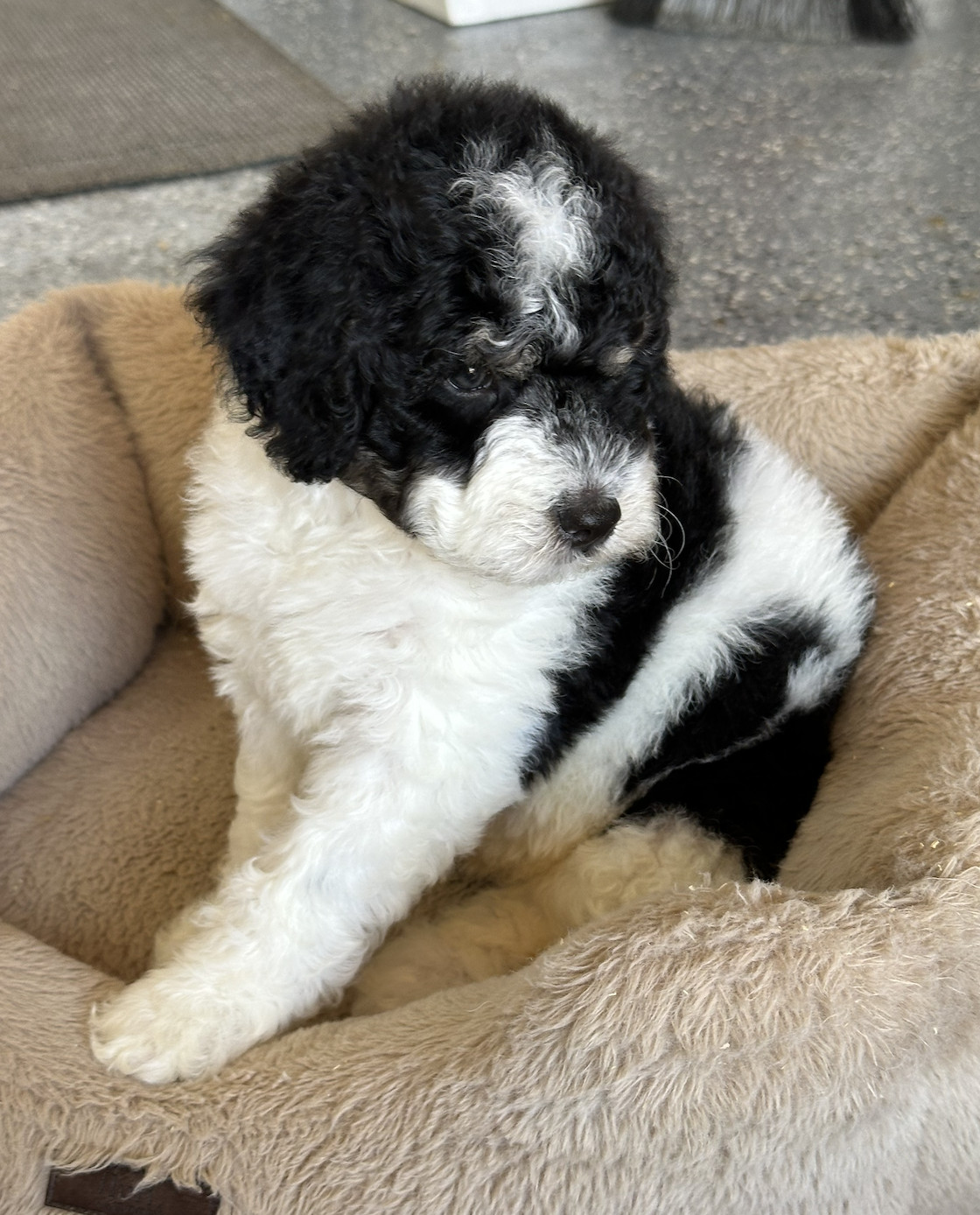 Bold and full of life, Ares is named after the god of war ⚔️—but this little warrior is all cuddles! Born August 09, 2025, he is estimated to be 20 lbs full grown. His parents are Breezy (30 lb F1B merle abstract Bernedoodle) and Apollo (100% merle phantom toy poodle). Ares will be ready to go home on October 1, 2025.