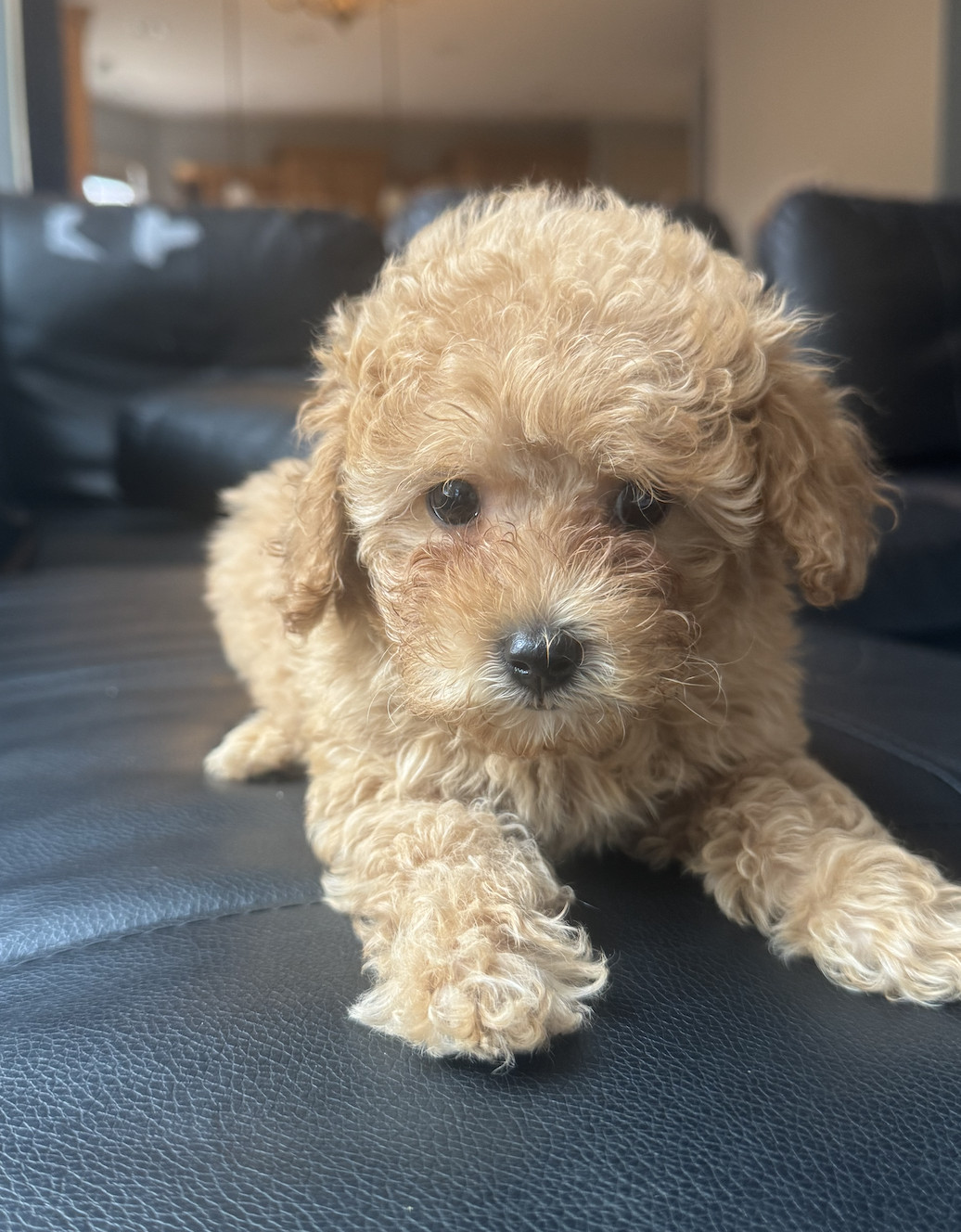 Austin is a handsome Mini Goldendoodle boy born on September 28, 2025. He’ll be ready to go home on November 22, 2025, and is expected to weigh around 7 lbs full grown. His mom, Missy, is a 14 lb F1B Mini Goldendoodle with a sweet, affectionate nature, and his dad, Winston, is our tiny 3 lb 91% teacup poodle. With his loving personality and adorable looks, Austin is sure to melt hearts wherever he goes.