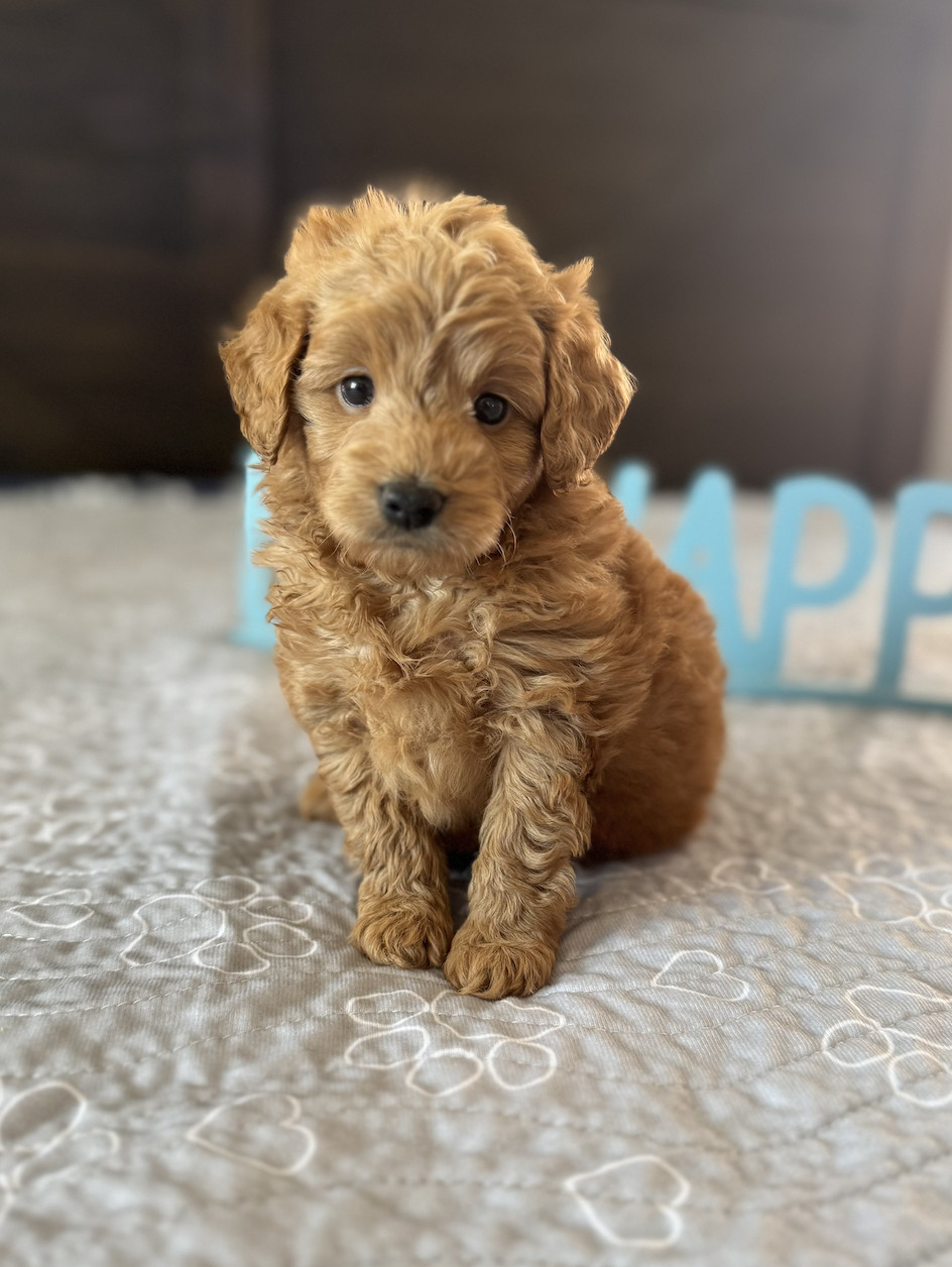 Meet Benny, the ultimate cuddle buddy! Born on August 18, 2025, this little guy is expected to weigh 15–20 lbs full grown. His mom, Maggie, is our loving 25 lb F1 Goldendoodle, and his dad, Starlord, is our 6.5 lb AKC-registered toy poodle. Benny will be ready to join his forever family on October 13, 2025.
