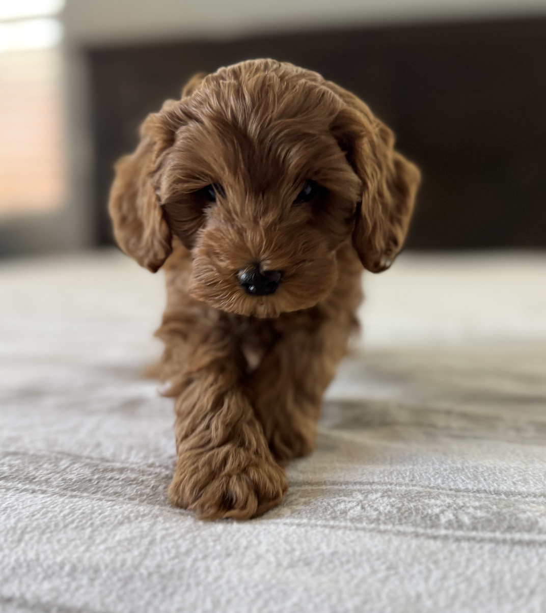 Charlie is an adorable Mini Goldendoodle boy born on September 10, 2025. He’ll be ready to go home on November 5, 2025, and is expected to weigh around 7 lbs full grown. His mom, Sadie, is our 9 lb F1B Mini Goldendoodle with a sweet and gentle personality, and his dad, Blaze, is a 6 lb AKC-registered red abstract Mini Toy Poodle. Charlie’s tiny size, soft curls, and affectionate nature make him the perfect little companion for any loving home.