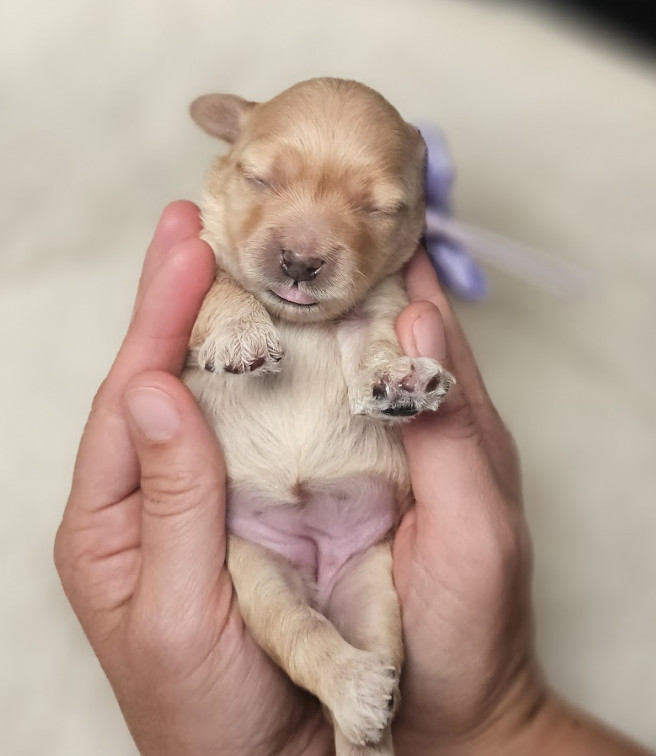 Cream is from a gorgeous pairing: Sunny, our 18 lb F1 Mini Goldendoodle known for her affectionate nature, and Winston, our tiny 3 lb, 91% Poodle with a proud AKC background. Cream carries all the best traits of her parents, making her the ideal Micro Goldendoodle for a loving family.
