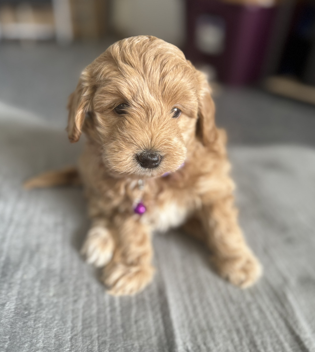 Elsa is full of charm and a dash of sass! She was born on March 25th and will be ready to join her forever family on May 20th. With an estimated adult weight of 15 lbs, she’s a great choice for someone wanting a smaller doodle with a big personality. Elsa is the daughter of Zoe, our cuddly mini Labradoodle, and Winston, our tiny but proud teacup poodle. With her sparkling eyes and affectionate nature, Elsa is sure to bring magic and joy into any home.