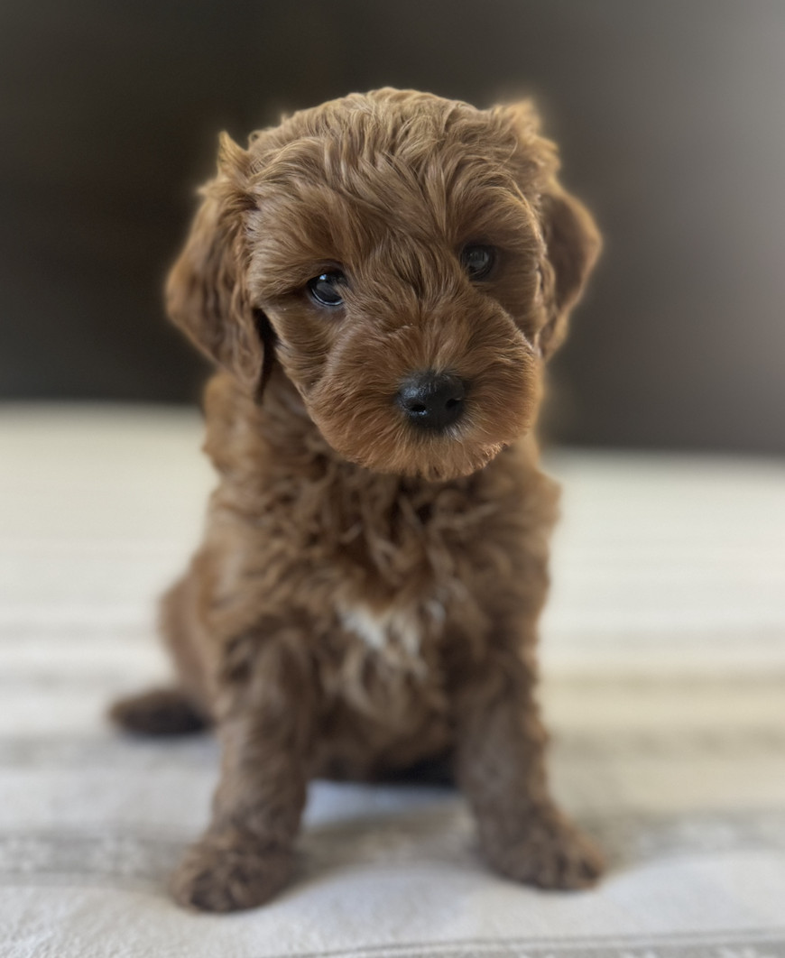 Ember is a stunning Mini Goldendoodle girl, born on September 26, 2025. She’ll be ready to go home on November 20, 2025, and will weigh around 12 lbs full grown. Her mom, Mesa, is a 22 lb F1 Mini Goldendoodle known for her sweet and gentle nature, and her dad, Winston, is our 3 lb 91% teacup poodle. Ember’s loving personality and soft, fluffy coat make her simply irresistible.