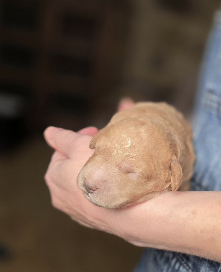 Melody is a sweet and precious Mini F1B Goldendoodle girl with a gentle, loving presence. She is expected to have a soft, low-shedding coat and an affectionate temperament that makes her a wonderful companion for families or individuals alike.