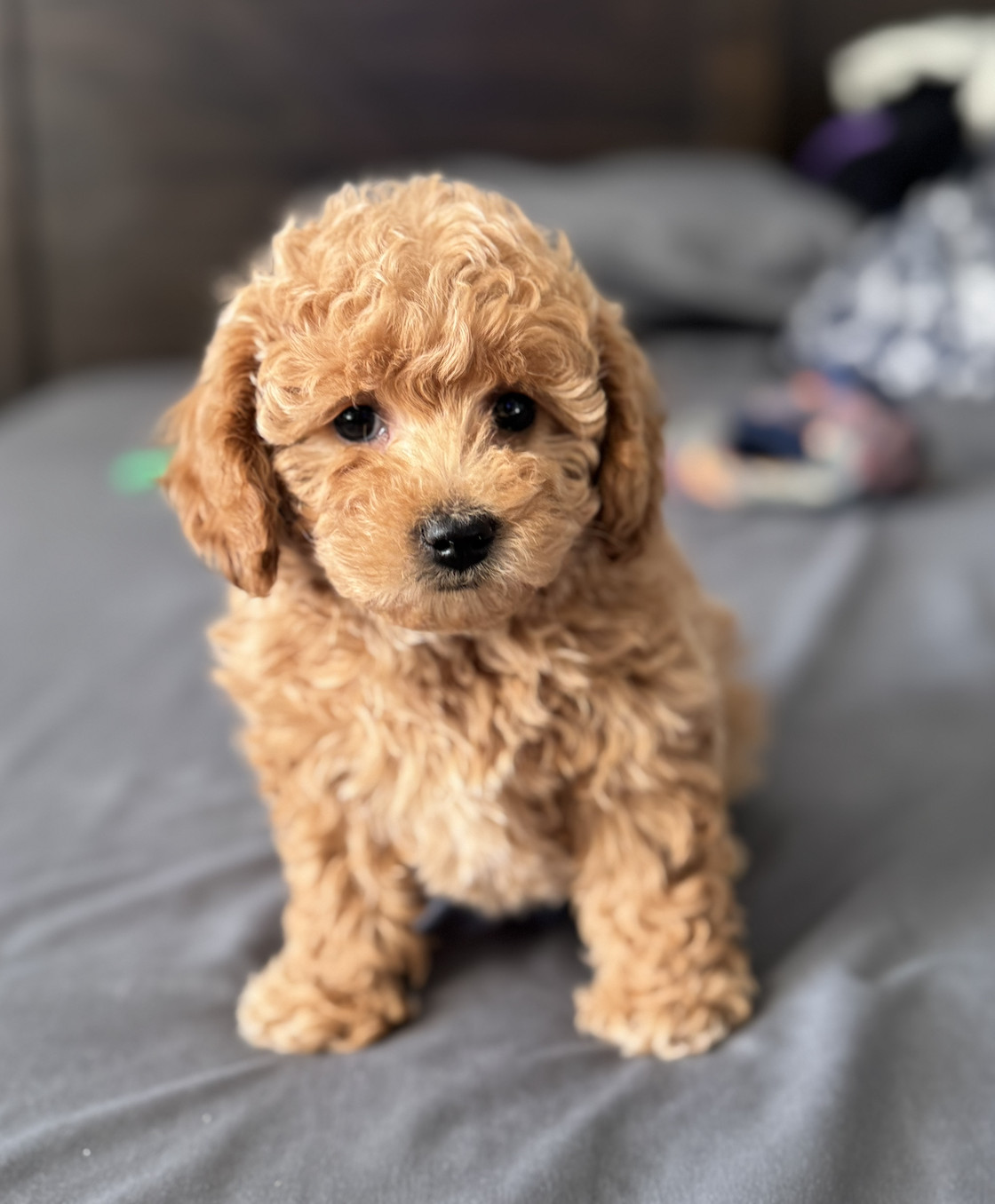 Hazel’s mama is Show Low, our gorgeous 15 lb mini Goldendoodle, and her dad is a smart and snuggly AKC-registered 7 lb poodle. Hazel inherits the best of both worlds: beauty, brains, and a hypoallergenic coat.
