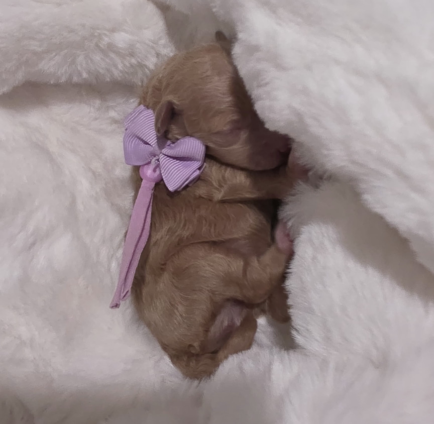Heaven is a sweet female Maltipoo with a gentle and loving personality. She was born on 04/11/2026 and comes from Evee, our 7 lb Maltipoo, and Winston, our tiny 3 lb (91% teacup) Poodle. We estimate Heaven will be around 5 lbs full grown. She will be ready to go to her forever home around 06/06/2026.