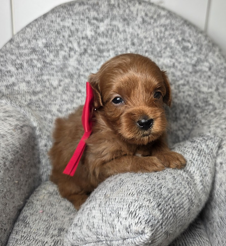 Meet Jinu, a handsome little guy born on August 18, 2025. He is estimated to grow to about 6–7 lbs full grown. His mom is Cinnamon, our 10 lb F2B Maltipoo, and his dad is Winston, our 3 lb 91% teacup poodle. Jinu will be ready to bring love and laughter to his new home on October 13, 2025.