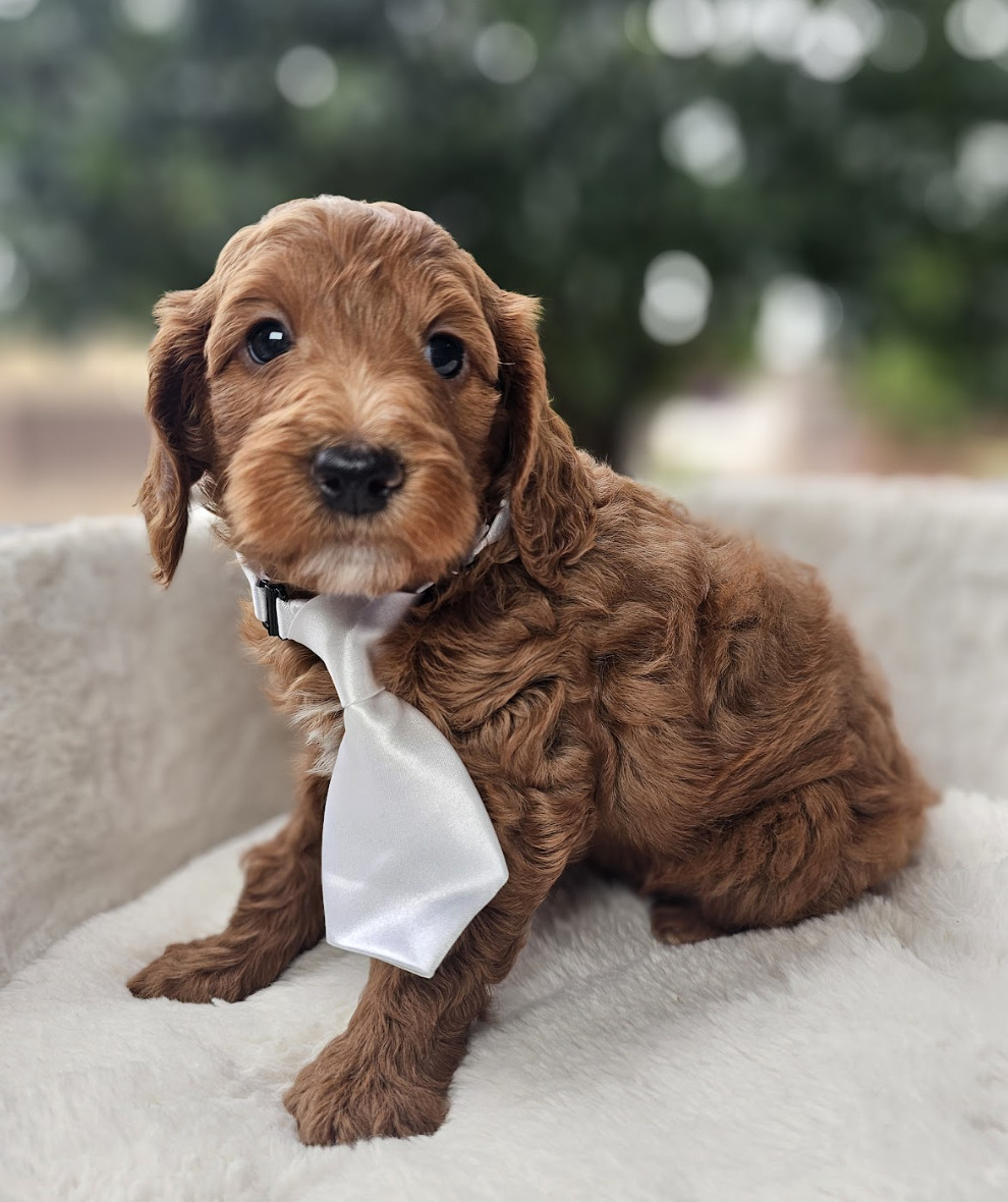 Say hello to Lucca, the sweetest little guy with a heart full of joy! Lucca was born on March 26, 2025, and is a Mini Goldendoodle expected to reach about 20 lbs. He'll be ready to join his new family around May 21st. Lucca’s parents are Koda, our 17 lb F1B Goldendoodle with championship bloodlines, and Natalia, our 28 lb AKC-registered red abstract Poodle known for her calm, obedient, and people-loving nature. Lucca is sure to be the perfect companion — loving, loyal, and adorable!