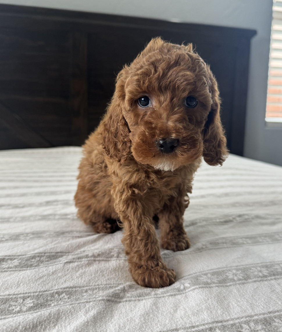 Lydia is a beautiful Mini Goldendoodle girl, born on September 30, 2025. She’ll be ready to go home on November 25, 2025, and will weigh about 20-25 lbs full grown. Her mom, Natalia, is a stunning AKC-registered red abstract poodle (28 lbs, clear genetics), and her dad, Hector, is a 12 lb multigen Mini Goldendoodle. Lydia is sweet, curious, and full of love—everything you’d want in a furry best friend.