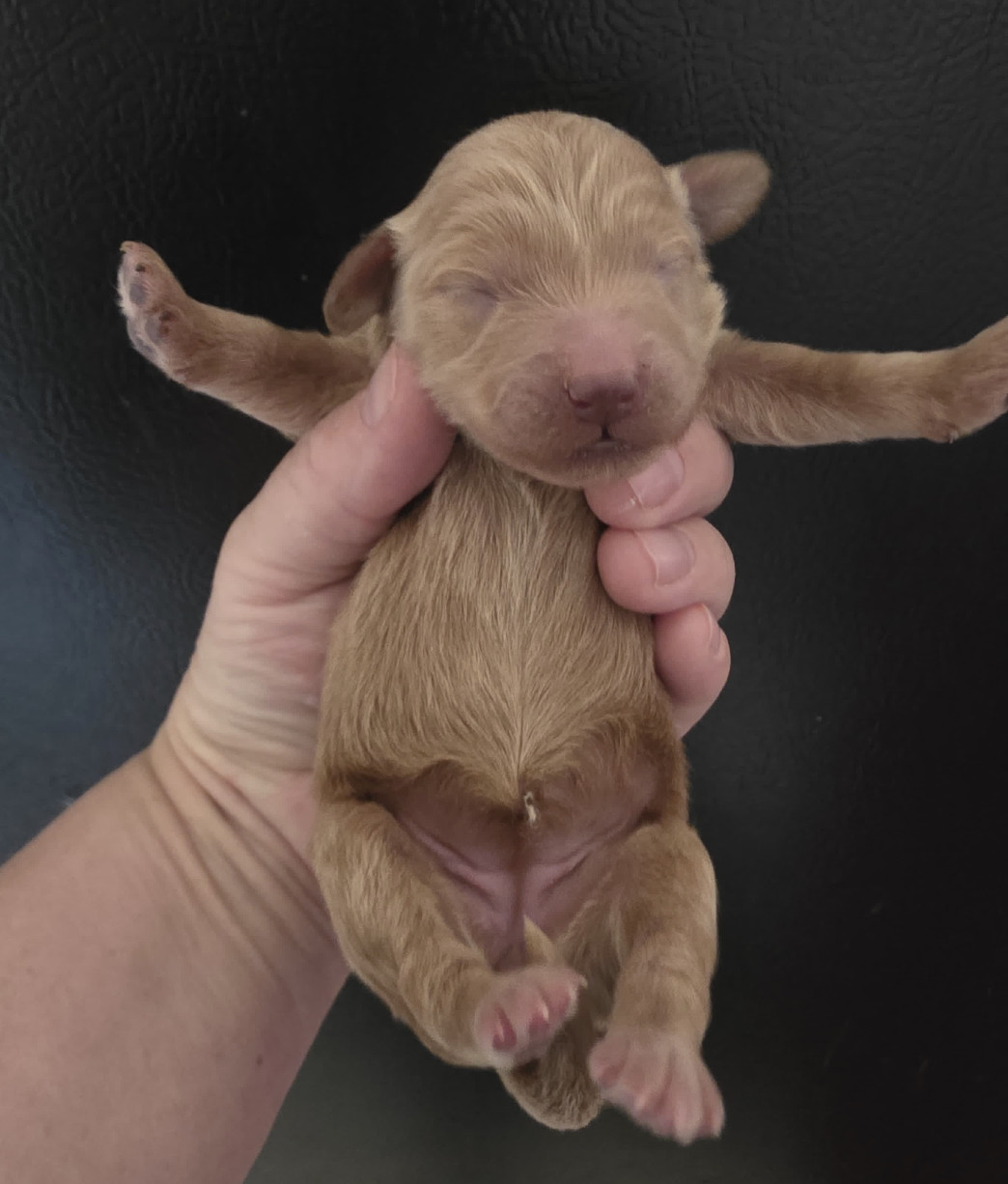 Olivia was born on April 4, 2026, and will be ready to go home around May 30, 2026. We estimate her adult weight to be around 15 lbs. As she continues to grow, we will be able to provide a more accurate estimate, as some puppies may be smaller and others slightly bigger.