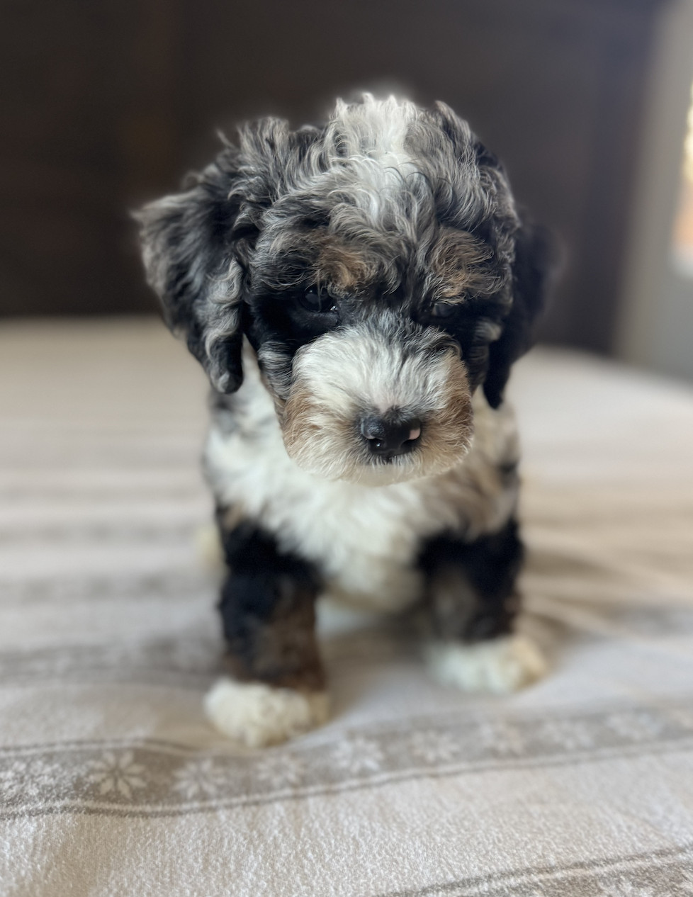 Inspired by modern Greek mythology favorite Percy Jackson ⚡, this little guy is already a hero in the making. Born August 09, 2025, Percy should reach about 20 lbs full grown. His mom is Breezy, our 30 lb F1B merle abstract Bernedoodle, and his dad is Apollo, our 100% merle phantom poodle. Percy will be ready for his forever adventure on October 1, 2025.