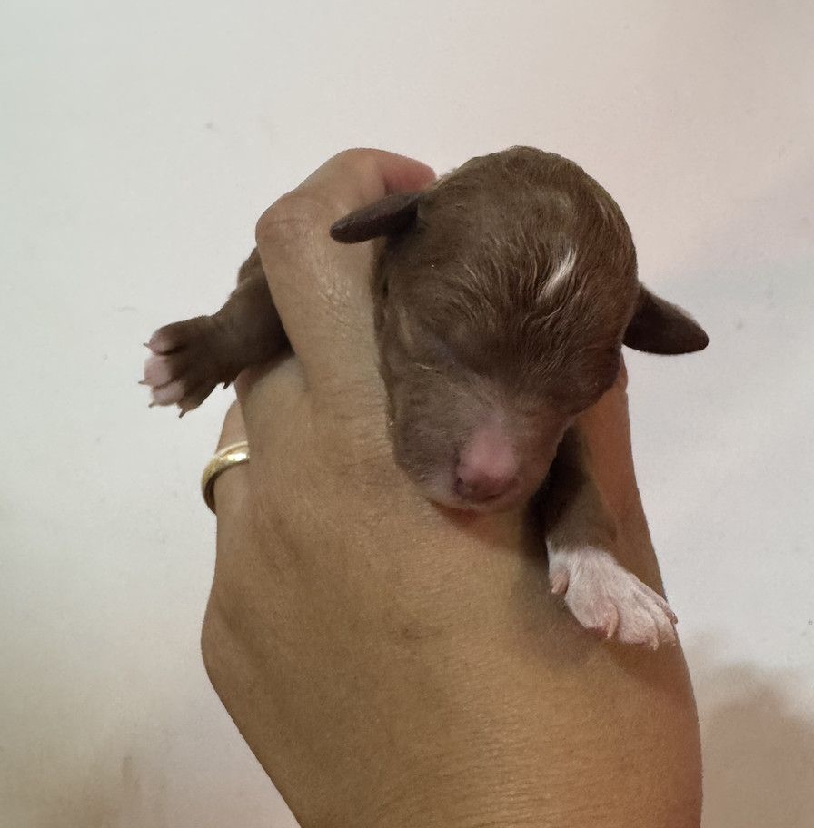 His mom, Natalia, is a 28 lb AKC registered red abstract Poodle with 100% clear genetics, and his dad, Kash, is a stunning 7 lb Mini Goldendoodle with an intense red coat and excellent structure.