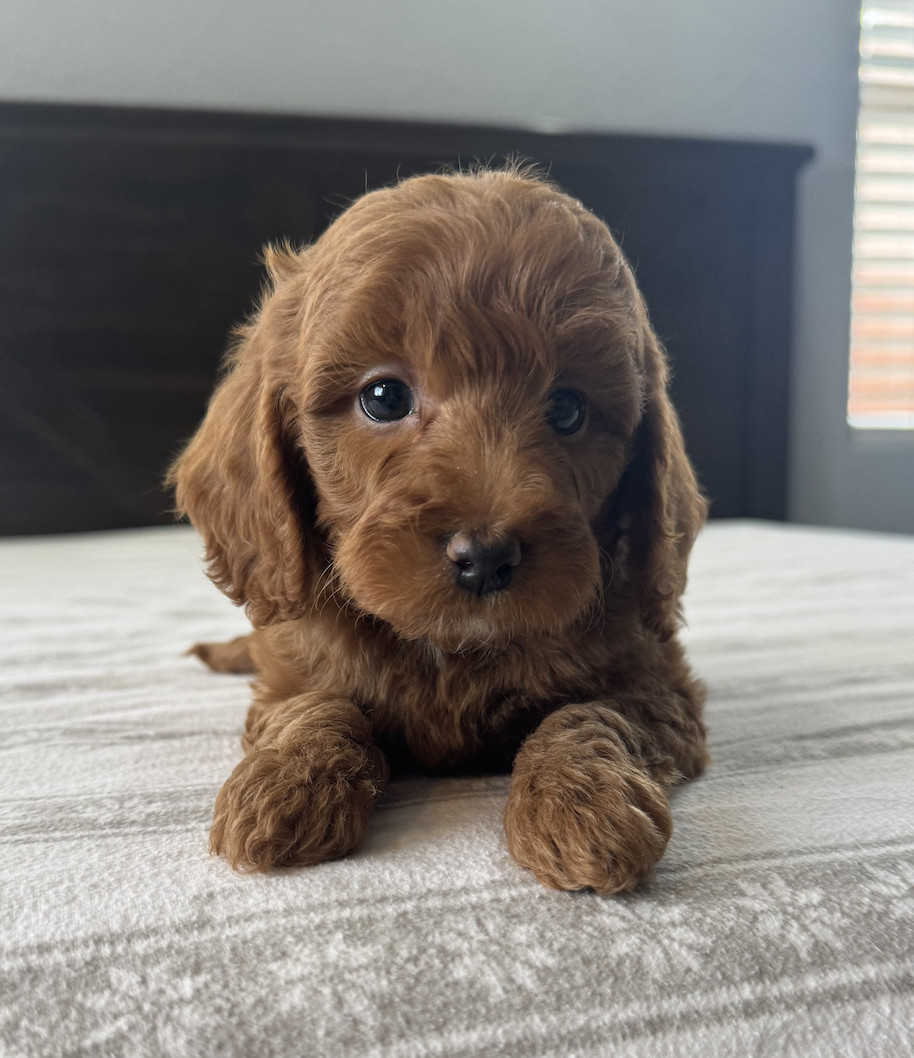 Watson is a fun-loving Mini Goldendoodle boy born on September 30, 2025. He’ll be ready for his forever family on November 25, 2025, and will weigh about 15 lbs as an adult. His mom, Natalia, is an AKC-registered 28 lb red abstract poodle known for her calm and human-oriented personality, and his dad, Hector, is a 12 lb multigen Mini Goldendoodle. Watson is the perfect blend of intelligence and affection.