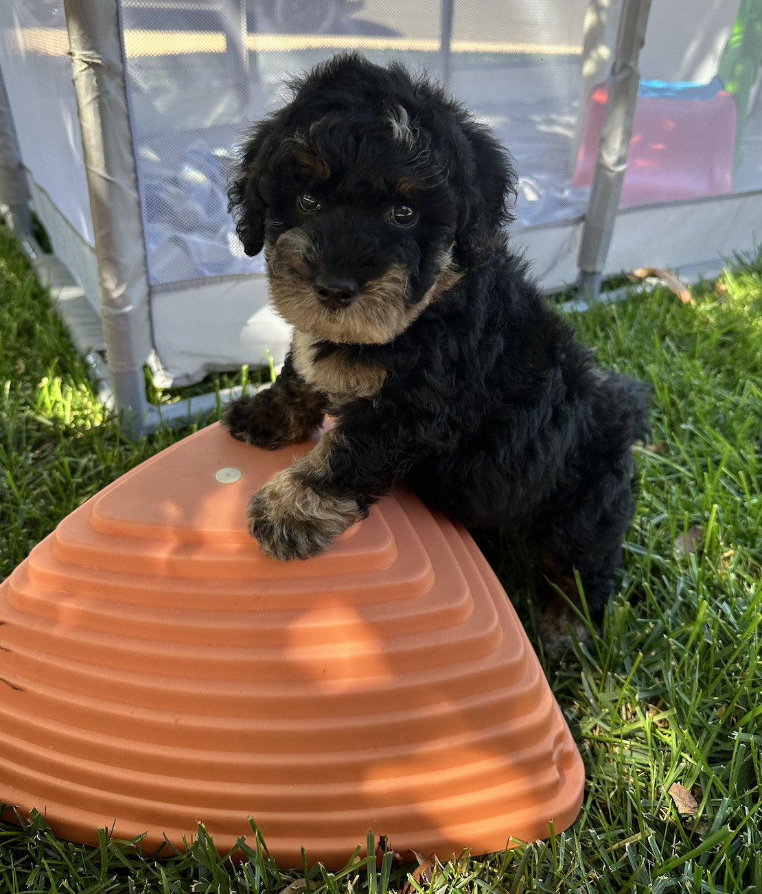 Born August 09, 2025, Zeus is one of the strongest names in Greek mythology—and this little guy lives up to it! We estimate he will weigh about 15 lbs full grown. His mommy is Breezy, our gorgeous F1B merle abstract Bernedoodle (30 lbs), and his daddy is Apollo, our 100% merle phantom toy poodle. With this powerful lineage, Zeus is destined to be both striking in looks and full of personality. He will be ready to go home October 1, 2025.